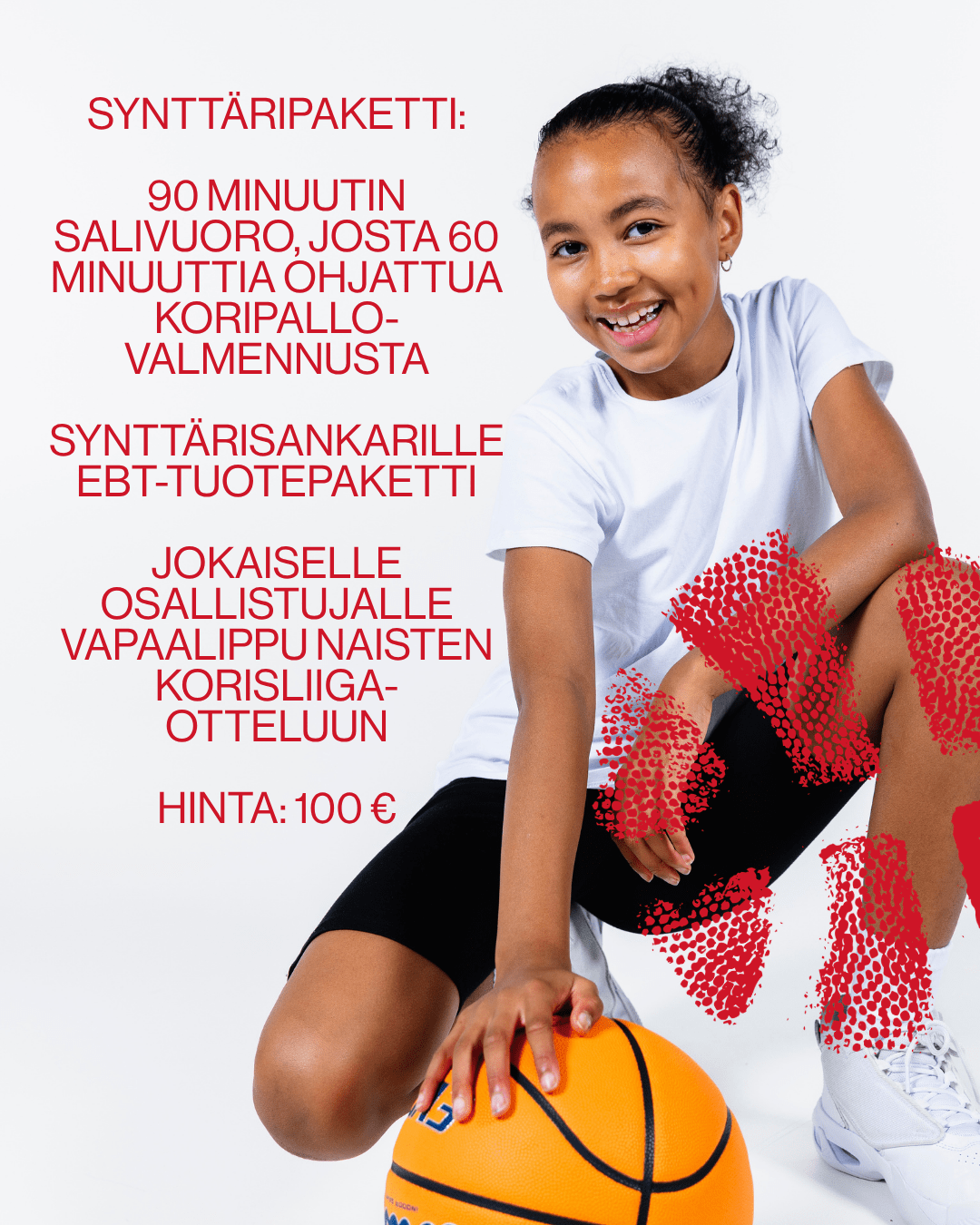 Synttäripakettiin kuuluu 1,5 tunnin salivuoro, josta ensimmäinen tunti on ohjattua koripallovalmennusta. Viimeiset 30 minuuttia juhlaväki saa pelailla vapaasti tai nauttia mahdollisista tarjoiluista! Synttärisankari saa EBT-tuotepaketin ja vieraat synttärivapaaliput, jotka oikeuttavat pääsyn yhteen Naisten Korisliiga -otteluun syksyllä 2026.