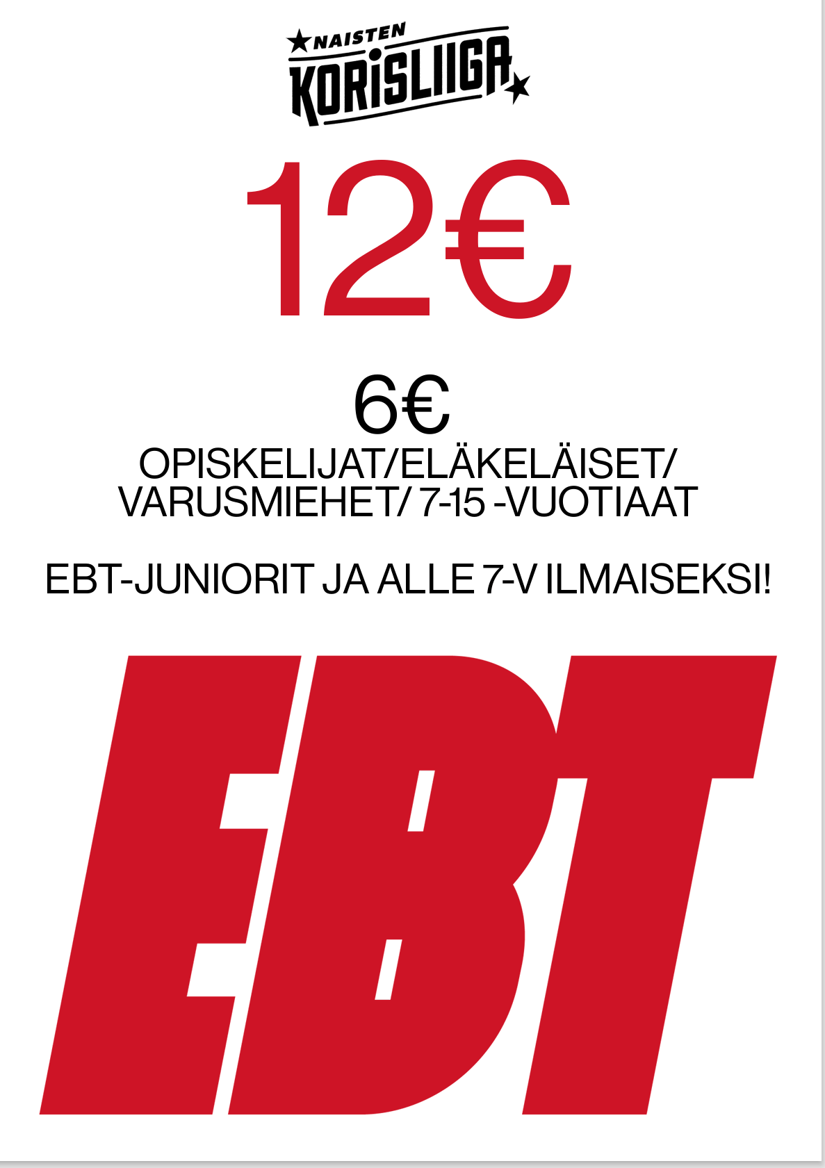 Kausikortti runkosarjan peleihin sekä mahdollisiin pudotuspeleihin maksaa 120e. Kortin voit ostaa naisten kotipeleistä MobilePay maksulla tai käteisellä. Jos haluat tilata kortin, laitathan asiasta viestiä osoitteeseen toimisto@ebt.fi ja lähetämme sinulle maksuohjeet. Kortti lähetetään sähköisenä joko puhelimella tai sähköpostilla maksun jälkeen.